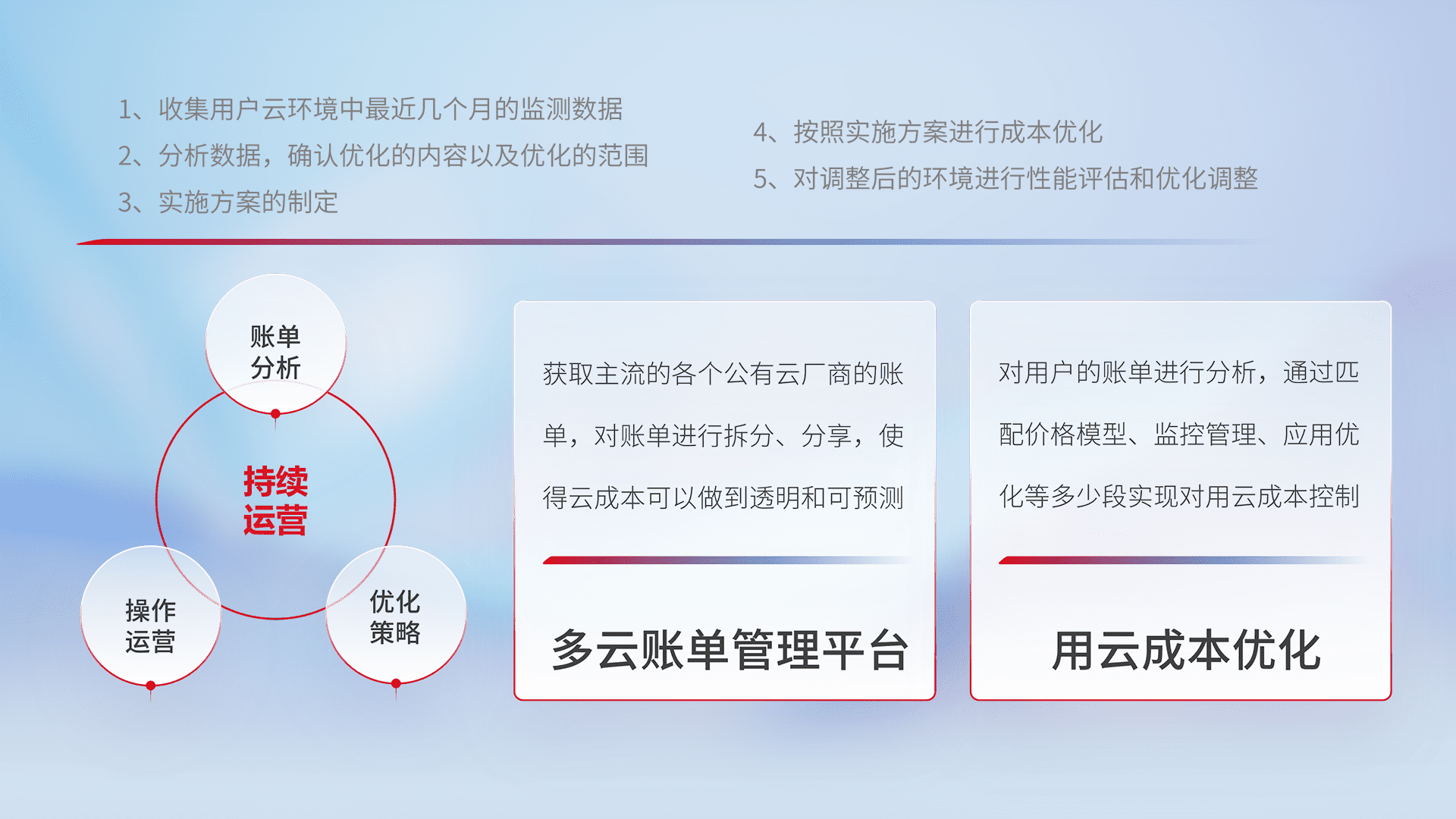 通过多云纳管,,,,以统一的资源数据模型把客户的云资源进行抽象和封装,,,进而实现对多云资源的统一操作,,,,保障云资源管理的可靠性、、、稳定性与可用性。。量身定制化运维内容,,,,配置、、、、开发运维、、、、补丁管理、、、备份、、、监控、、、、认证和访问管理、、、、审计和日常巡检等,,,,保障在用云过程中的可靠度,,,,稳定度以及高可用率。。。